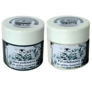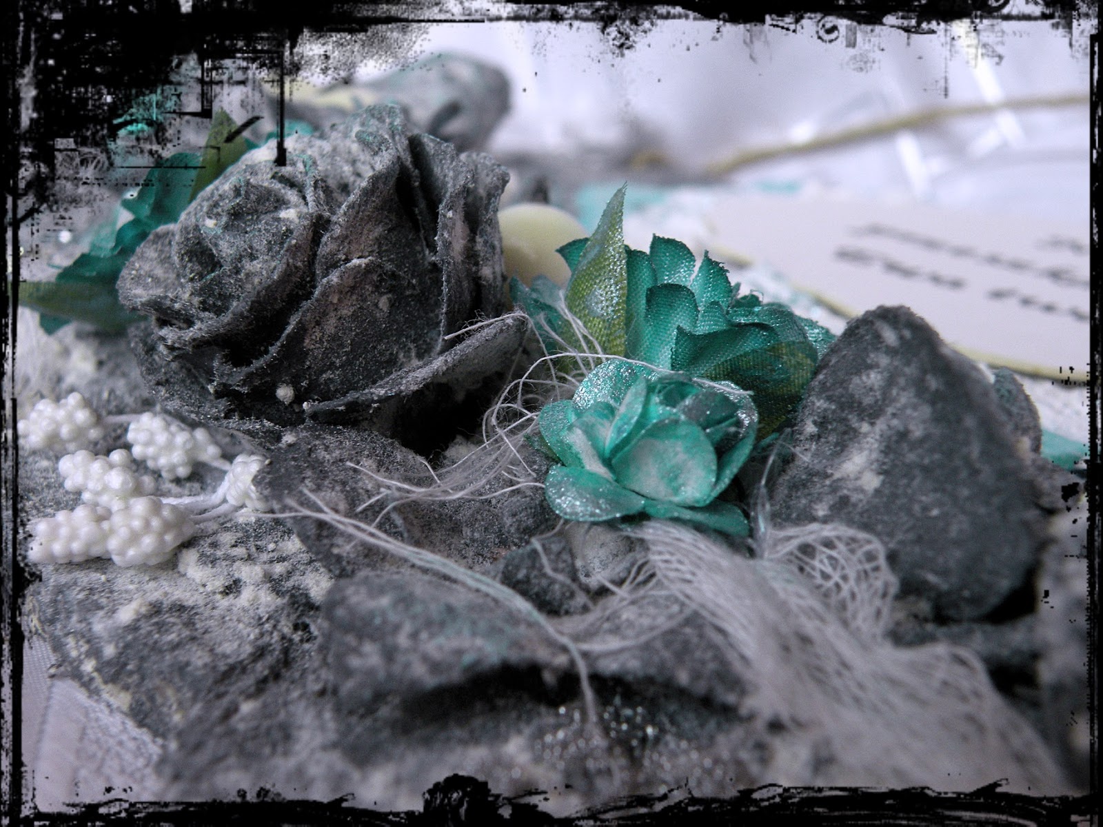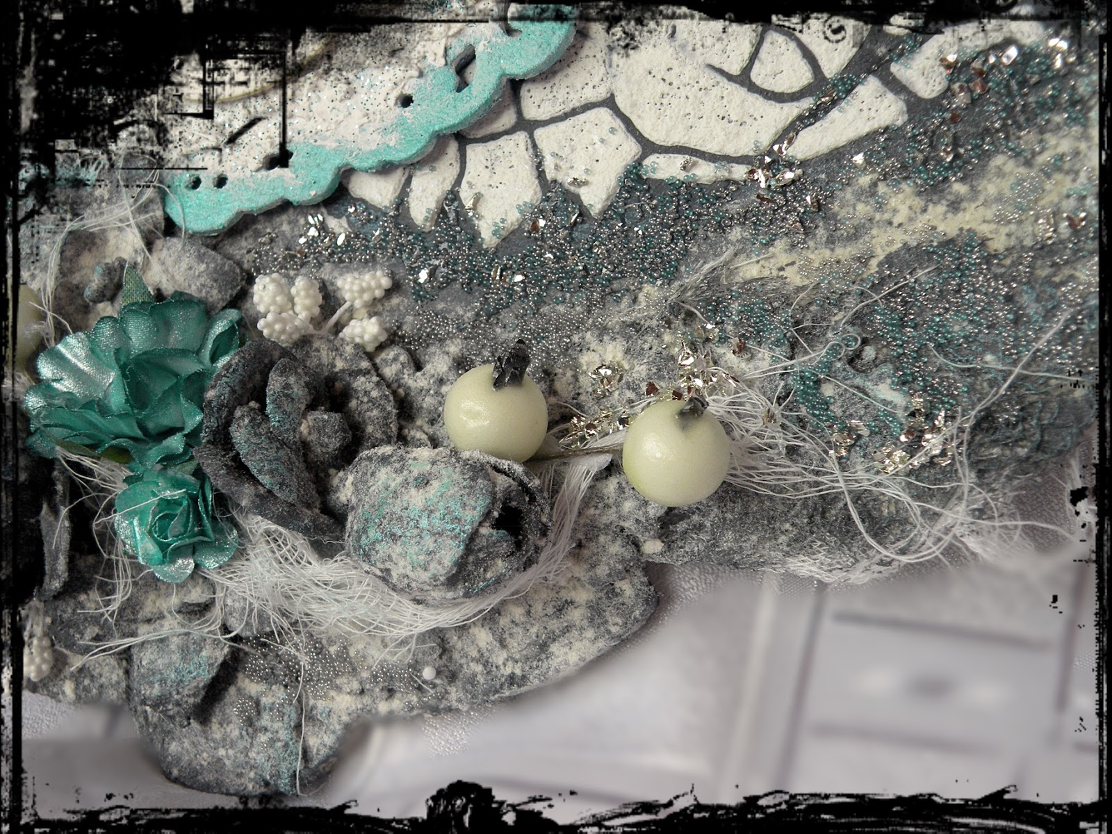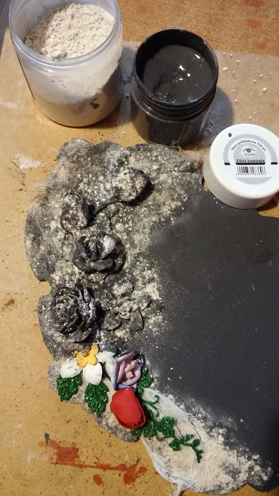 Na prezent gwiazdkowy zrobiłam tabliczkę również z użyciem tych preparatów. Po przyklejeniu kwiatków, listków, gazy pomalowałam wszystko farbą podkładową, a następnie wcierałam pył i tak powstały kamienne kwiaty, które bardzo mi się spodobały. Można tu wykorzystać wszelkie przydasie i to jest super!