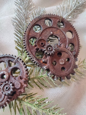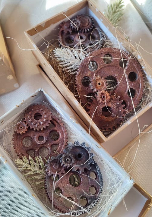 Świąteczna inspiracja dla miłośników steampunkowych klimatów. Rdzawe tryby na choinkę, czemu nie! Odlewy z żywicy poliuretanowej, czarne gesso i dwa sposoby na uzyskanie rdzy.
